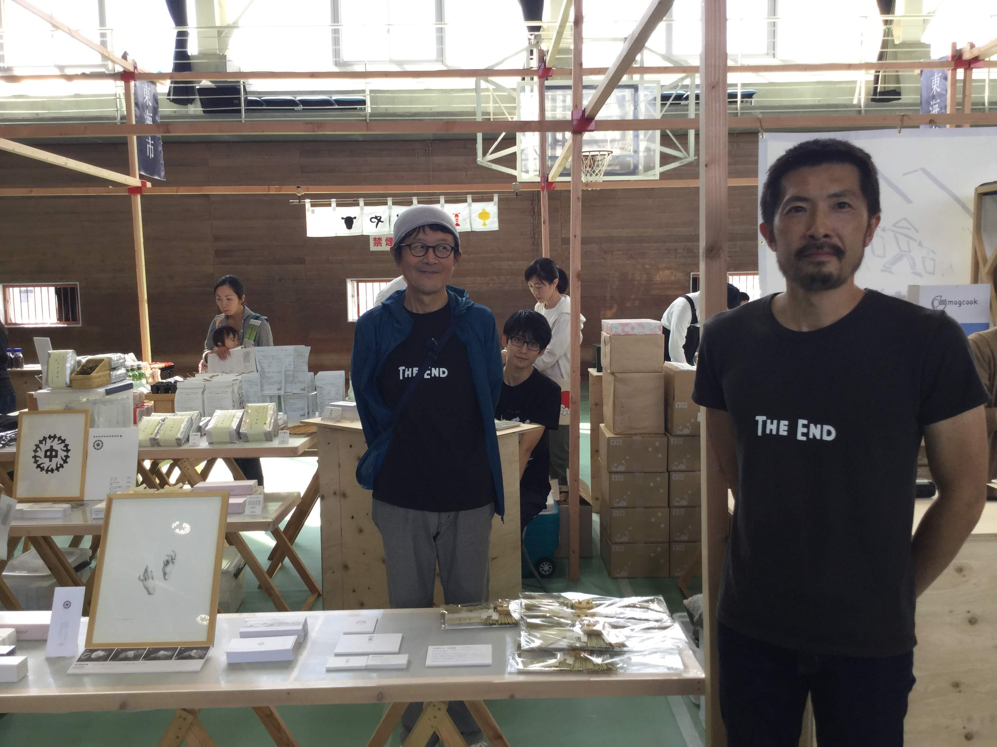いつも中谷武司デザインのTシャツを着てくれているでく工房の中村さんと新人バイトOくんと中谷武司です。